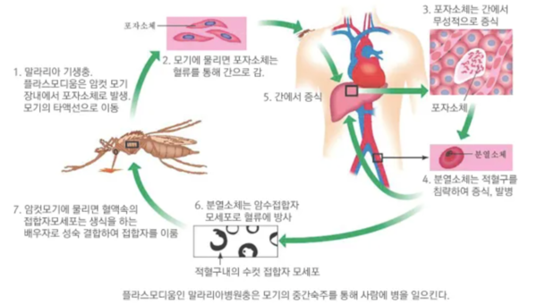 말라리아는 삼일열원충에 감염된 모기에 물려 전염되며, 대표적인 증상은 고열과 오한, 발한이 48시간 주기로 반복되는 것이다. 두통, 구토, 설사 등 소화기 증상이 동반되기도 한다.