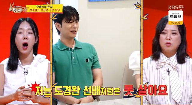 앞서 24일 방송된 KBS 2TV '사장님 귀는 당나귀 귀'에서는 김진웅이 선배 아나운서 엄지인과 함께 결혼정보회사를 찾았다. 이때 엄지인은 남자 아나운서 중 결혼을 가장 잘한 사람으로 도경완을 꼽았고, 김진웅은 "선배님한테 결례인 말일 수도 있지만 누군가의 서브로는 못 산다"고 말했다.