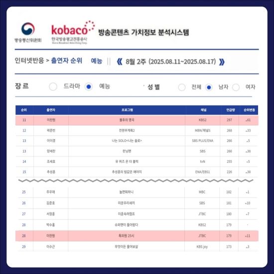 한편, 이찬원은 같은 기간 JTBC '톡파원 25시'로 28위에 이름을 올렸다. 또한, 그가 진행을 맡았던 '셀럽병사의 비밀'은 9월 2일부터 정규 프로그램으로 편성될 예정이다.