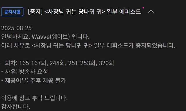 25일 웨이브 측은 KBS 2TV '사장님 귀는 당나귀 귀'(이하 '사당귀') 일부 에피소드의 다시보기 서비스를 중단한다고 알렸다. 중지된 회차는 165-167회, 248회, 251-253회, 320회로, 이 중 320회는 최근 논란의 중심에 선 김진웅이 출연한 편이다.