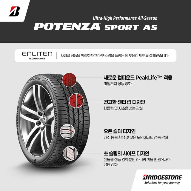 포텐자 스포츠 AS는 브리지스톤의 고성능 스포츠 타이어 브랜드 ‘포텐자’ 라인업의 최신 모델로, 브리지스톤만의 엔라이튼(ENLITEN) 차세대 기술 플랫폼이 적용됐다. 이를 통해 사계절 전천후 주행 성능과 지속 가능성을 실현했다.