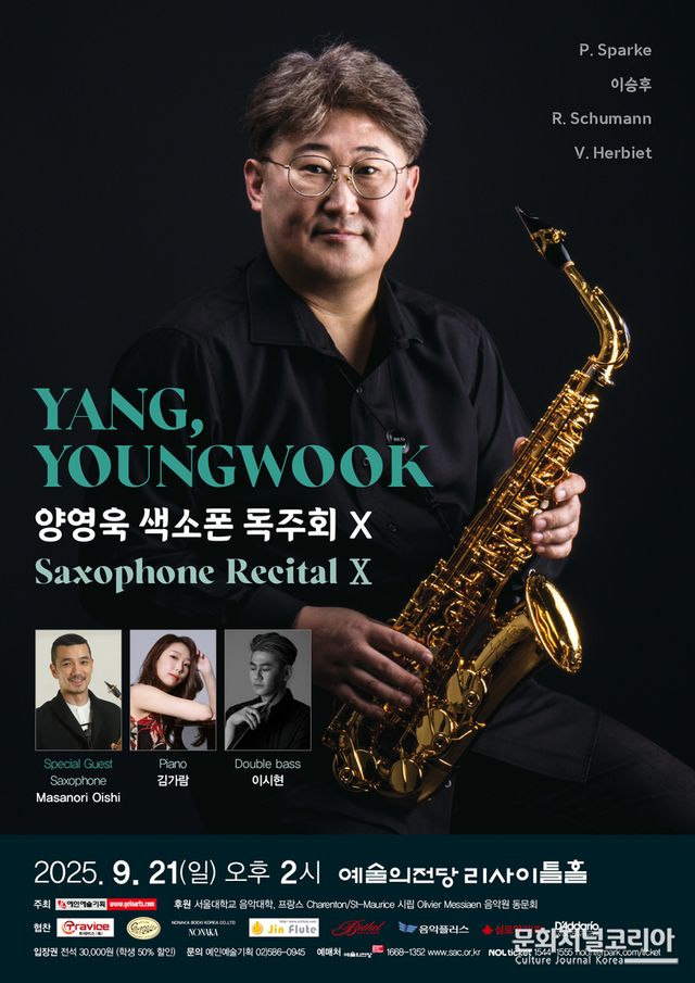 문화저널코리아 김영일 기자 | 깊이 있는 해석과 폭넓은 다이내믹, 감각적인 선율로 주목받는 색소포니스트 양영욱은 서울대학교 음악대학을 졸업한 후 프랑스로 유학, Charenton/St-Maurice 시립 Olivier Messiaen 음악원에서 Fin de Cycle 3 디플롬을 취득하고 최고연주자과정(Cycle Concertiste, Niveau Professionnel)을 만장일치 1등으로 졸업하였다.