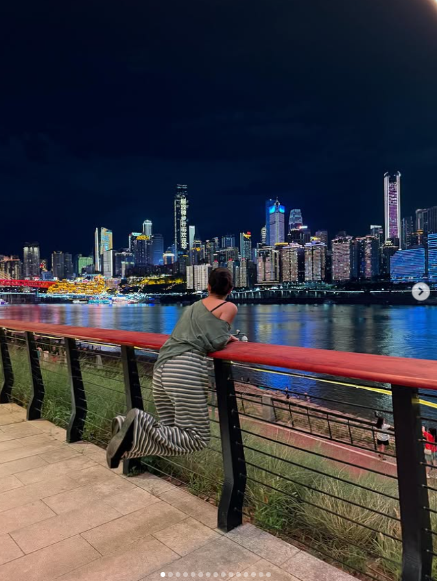 솔라가 서 있는 곳은 장강변 산책로 일대로 보인다. 강 건너편으로는 충칭의 고층 빌딩 스카이라인이 형형색색의 네온사인으로 빛나고, 멀리 보이는 다리와 홍야동(洪崖洞)의 전통 건축 조명이 더해져 황홀한 풍경을 만들어낸다. 이곳은 충칭 여행자라면 반드시 들르는 대표적인 야경 명소로 꼽힌다.