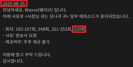 결국 문제의 발언이 담긴 '사장님 귀는 당나귀 귀' 320회는 다시보기 서비스가 중단됐다. OTT 측은 방송사의 요청으로 320회 다시보기가 불가하다며 "추후 제공 불가"라는 설명을 덧붙였다.