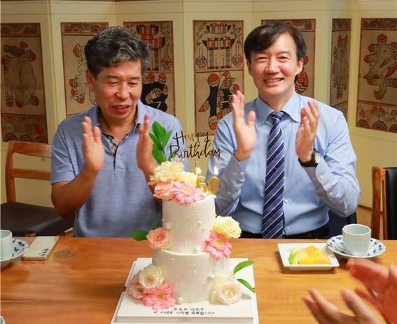 공개된 사진에는 조 전 대표와 백 전 비서관이 케이크 앞에서 환하게 웃으며 손뼉을 치는 모습이 담겼다. 케이크에는 '조국&백원우, 새로운 시작을 축복합니다'라는 문구와 함께 숫자 초 '60'이 꽂혀 있었다.
