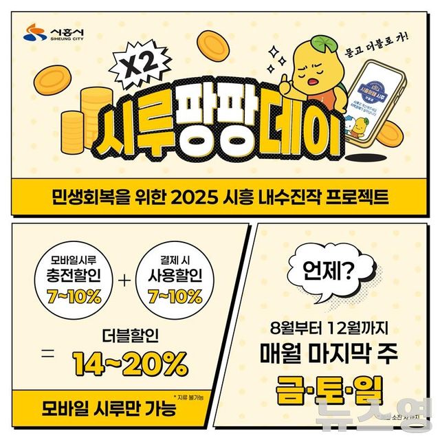 시흥시의 2025년 하반기 민생회복 프로젝트 ‘흥해라 흥세일’의 핵심 이벤트인 시루팡팡데이는 지역 내수경기 진작을 위해 시행된다. 시흥시 지역화폐 모바일 ‘시루’ 충전 시 7~10%를 할인받고, 시루 가맹점에서 결제 시 추가로 7~10%를 할인받는 2배 할인 행사다.