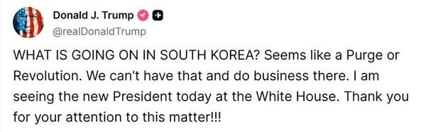 뉴시스 보도에 따르면, 트럼프 대통령은 이날 SNS 트루스소셜에 "한국에 무슨 일이 일어나고 있나? 숙청 또는 혁명이 일어난 것으로 보인다(WHAT IS GOING ON IN SOUTH KOREA? Seems like a Purge or Revolution)"고 적었다.