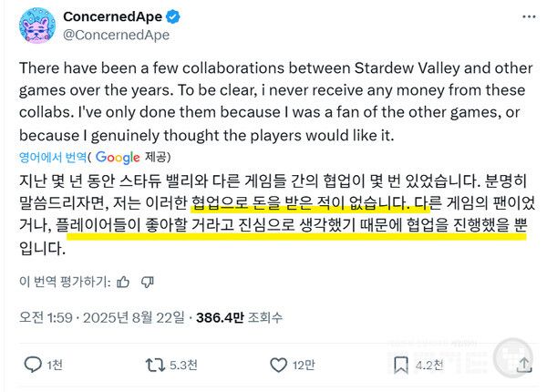 더 큰 문제는 바론은 콜라보를 허용했다는 이유만으로 소셜미디어에서 비판받기 시작한 것이다. 논란이 커지자 바론이 22일 X를 통해 직접 해명에 나섰다. "스타듀 밸리와 다른 게임들 간의 콜라보가 몇 차례 있었다. 분명히 얘기하지만, 나는 이 콜라보들로 돈을 받지 않는다. 저는 그저 다른 게임의 팬이었거나, 진심으로 플레이어들이 좋아할 거라고 생각했기 때문에 진행했다." 한 팬이 그가 돈을 받아도 마땅하다고 하자, 바론은 "고맙지만 괜찮다. 게임 판매로 충분히 벌었다"라고 답했다.
