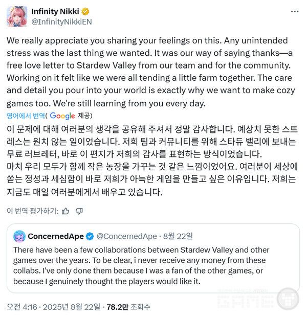 바론의 성명 이후 인피니티 니키 개발사도 사과문을 발표했다. "의도치 않은 스트레스는 저희가 가장 원치 않던 일이었다. 이는 저희 팀이 스타듀 밸리와 커뮤니티에 보내는 무료 러브레터 같은 것이었다"라고 해명했지만, 팬들의 분노는 쉽게 가라앉지 않고 있다.