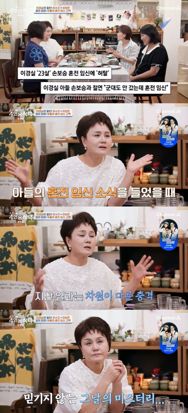 이날 이경실은 "지금 방송하는 사람들로서 나처럼 산전수전 공중전, 우주전을 겪은 사람은 없다. 근데 우리 아들이 애를 가졌다고 했을 때는 근데 어떻게 내가 할 수가 없는 일이지 않냐"면서 아들 손보승의 혼전 임신 소식에 놀랐던 마음을 드러냈다.