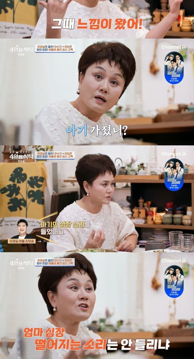 이경실은 아들이 먼저 임신 소식을 알리기 전 원천을 알 수 없는 직감이 딱 들었다고. 이어 당시 상황을 전해 눈길을 끌었다.
