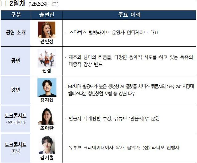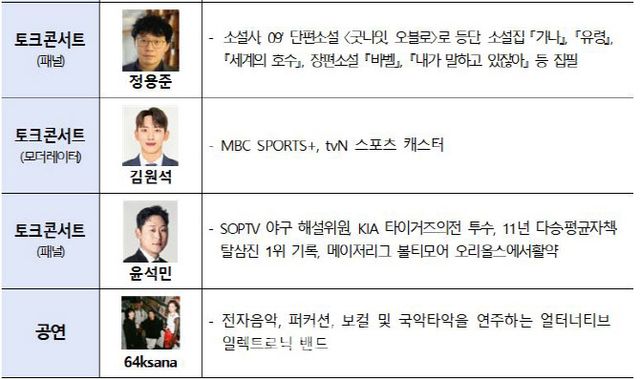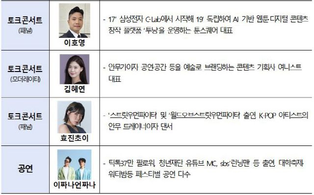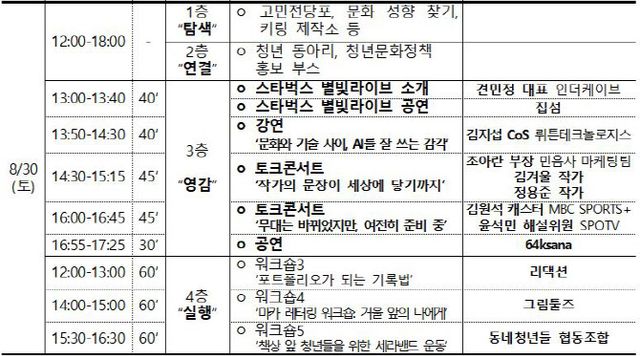 그중 ‘영감의 방’에서는 다양한 분야의 연사와 청년 예술인을 만날 수 있다. △전 프로야구 기아 타이거즈 투수 윤석민을 비롯해 △이지현 널위한문화예술 대표 △임수열 프렌트립 대표 △이호영 툰스퀘어 대표 △케이팝 안무가 효진초이 △조이란 민음사 부장과 △작가 김겨울 △정용준 등이 강연과 토크콘서트로 청년과 소통할 예정이다. △자작 가수 김마리와 △힙합 듀오 이짜나언짜나 △국악기반 전자밴드 64크사나(ksana) △스타벅스코리아의 청년 문화예술 인재 후원 사업인 ‘별빛라이브’를 운영하는 인더케이브 견민정 대표와 △밴드 집섬은 공연 무대에 오른다.