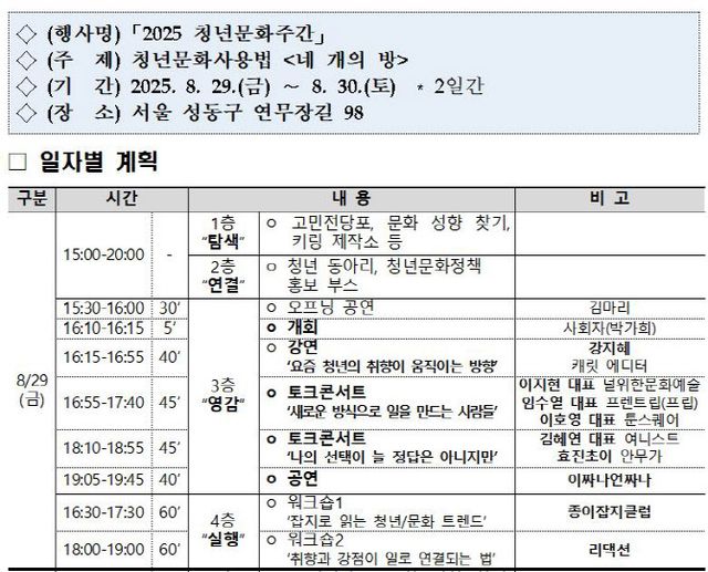 문화체육관광부는 이달 29∼30일 성수동 복합문화공간에서 ‘청년문화사용법: 네 개의 방’을 주제로 ‘2025 청년문화주간’을 개최한다고 26일 밝혔다.