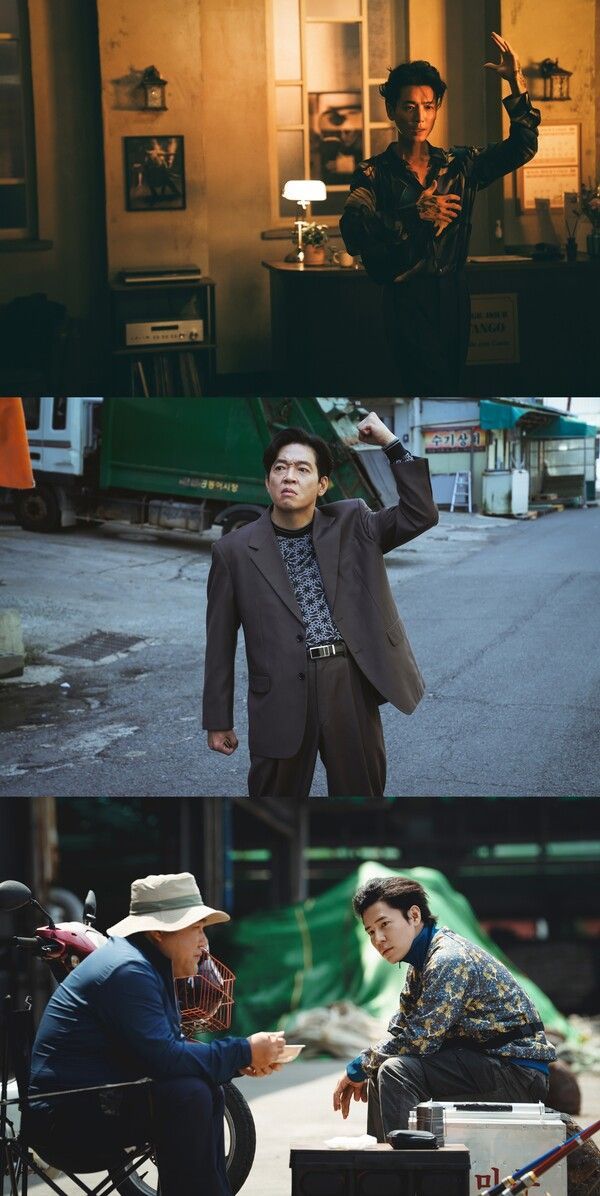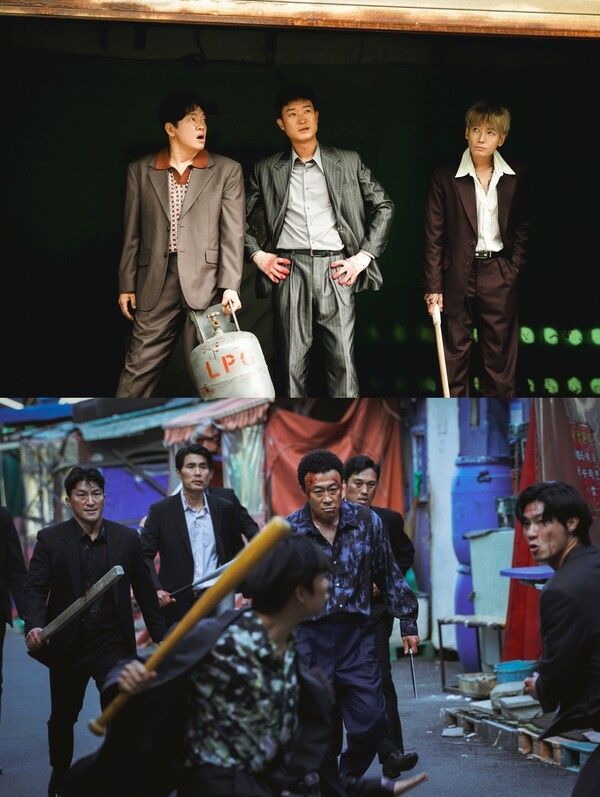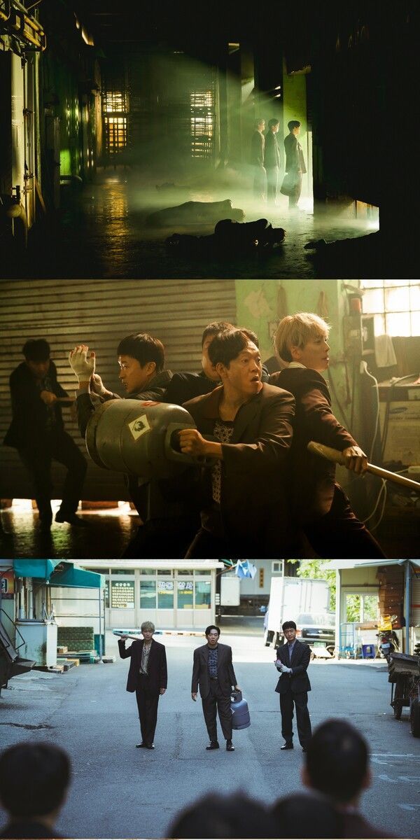 26일 공개된 스틸에서는 배우들의 빛나는 케미스트리와 함께 각 캐릭터들의 개성 넘치는 매력을 한눈에 확인할 수 있다. 먼저 '식구파' 3인방의 과거부터 현재까지를 엿볼 수 있는 스틸이 눈길을 끈다. 서로의 등을 맞댄 채 '순태'(조우진)는 목장갑을, '강표'(정경호)는 목검을, '판호'(박지환)가 가스통을 이용해 상대 조직원들과 사투를 벌이는 모습은 세 사람의 서로 다른 액션 스타일과 다채로운 매력을 엿볼 수 있어 기대감이 증폭된다.