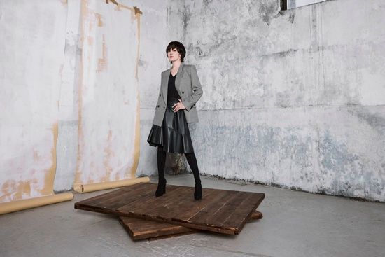 또 다른 컷에서는 가을의 깊이감을 담은 듯한 다크 그레이 컬러의 프릴 니트 가디건과 스커트를 매치해 편안하면서도 고급스러운 스타일을 더했다.