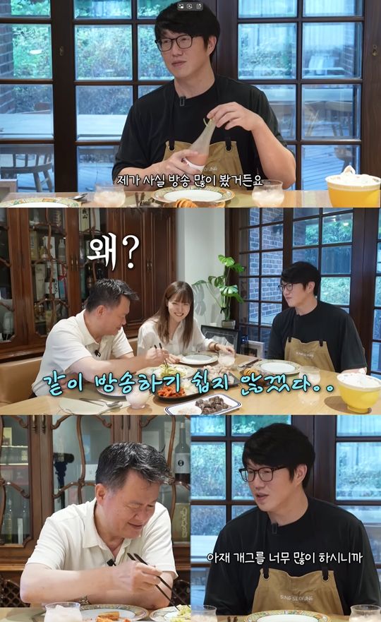 이후 성시경은 '여가네' 채널을 언급하며 "사부님 방송을 많이 보는데, 같이 방송하기 쉽지 않겠다"며 속마음을 드러냈다. "아재 개그를 너무 많이 하신다"는 성시경의 말에 "그게 원래 내 말투"라며 여경래 셰프와 티키타카로 웃음을 자아냈다.