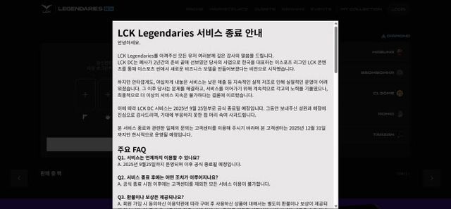 26일 오후 LCK 레전더리스 측은 자사 홈페이지 공지를 통해 다음달 25일 공식 종료다고 밝혔다.