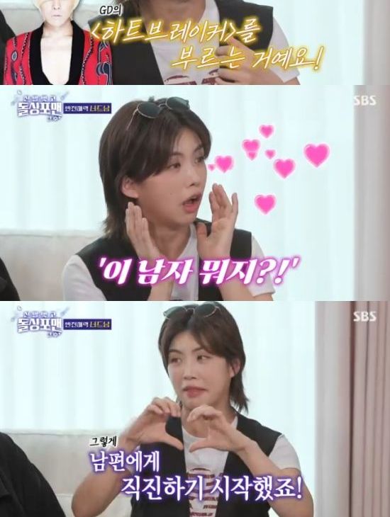 이어 "카페에서 만났는데 말도 없고 재미도 없더라. 그래서 2차로 소개시켜준 커플하고 넷이서 노래방을 갔다. 근데 갑자기 조용했던 남편이 GD의 '하트브레이커'를 부르더라. 그런데 나쁘지 않았다. 그 모습이 반전이었다"면서 웃었다.
