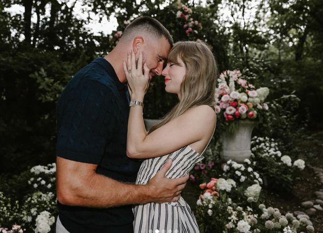 공개된 사진 속 테일러 스위프트는 꽃이 만발한 배경에서 트래비스 켈시의 품에 안겨 행복한 미소를 짓고 있는 모습. 특히 테일러 스위프트의 손에서 빛나는 초대형 다이아몬드 반지가 시선을 사로잡았다.
