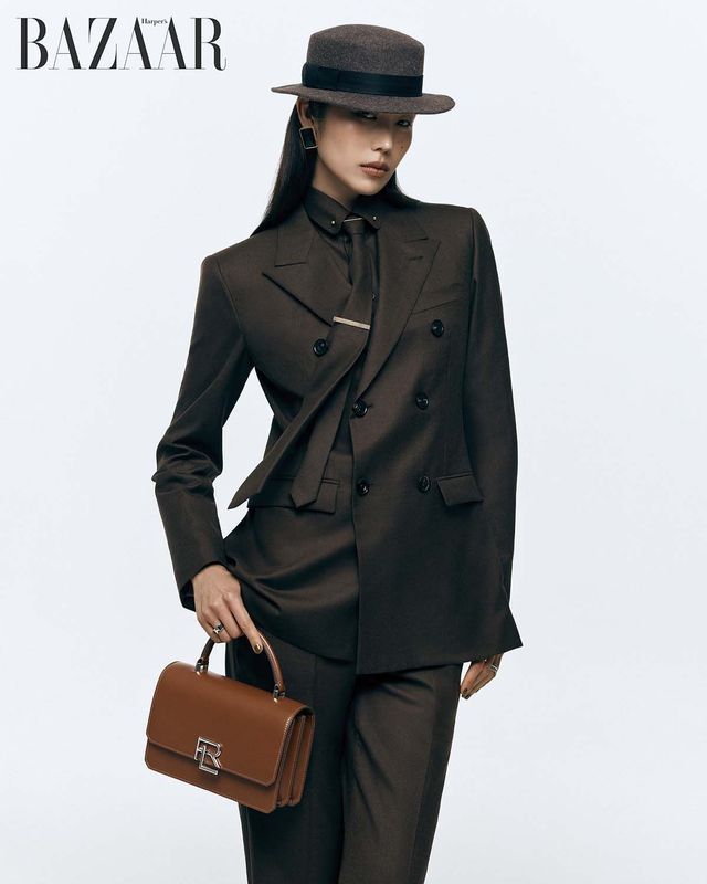 더블 버튼 재킷, 셔츠, 팬츠, 보터햇, 귀고리, 타이, 타이 클립은 모두 Loro Piana. 오른손 약지와 왼손 검지에 착용한 링은 Hermès. 왼손 약지에 착용한 링은 16만9천원 Portrait Report. 핸드백은 Ralph Lauren Collection.