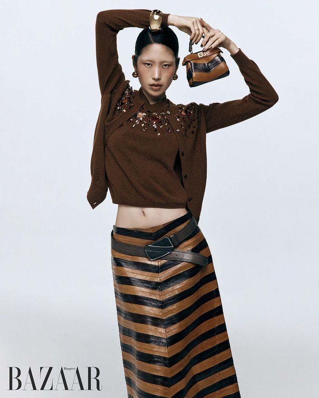 크리스털 장식 카디건은 4백만원대, 니트 톱은 3백만원대, 먹장어 가죽 스커트는 1천1백만원대, 미니 핸드백은 2백만원대, 뱅글, 귀고리는 가격 미정 모두 Fendi. 오른손에 착용한 2개의 반지는 Louis Vuitton. 벨트는 Diesel.