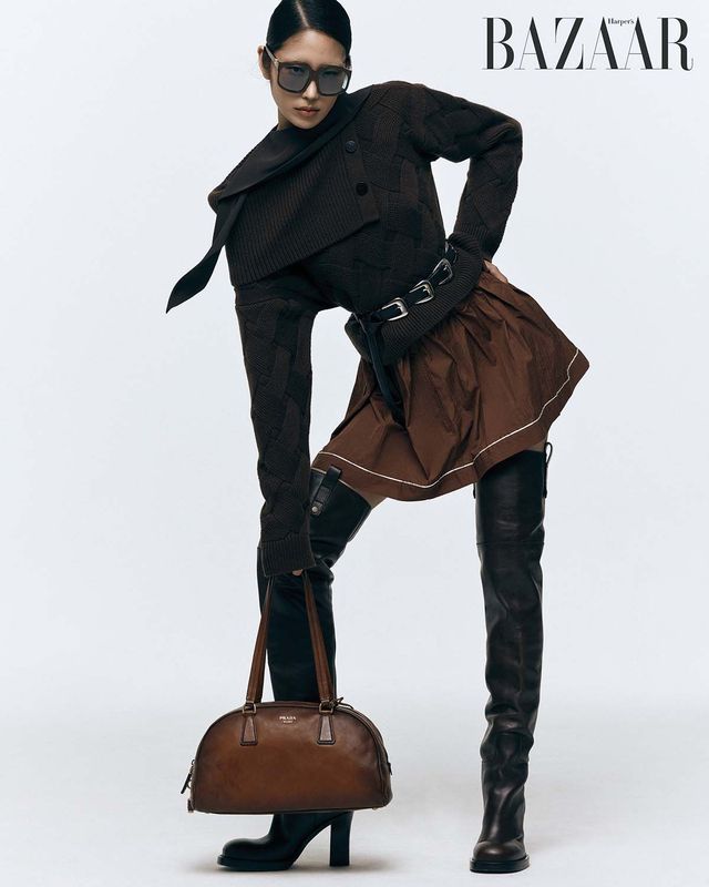버튼 니트 톱은 Hermès. 이너로 입은 블라우스는 Celine. 코튼 스커트, 볼링 백은 Prada. 오벌 스퀘어 프레임 선글라스는 59만원대 Miu Miu by Essilor Luxottica. 벨트는 Rokh. 사이하이 부츠는 Burberry.