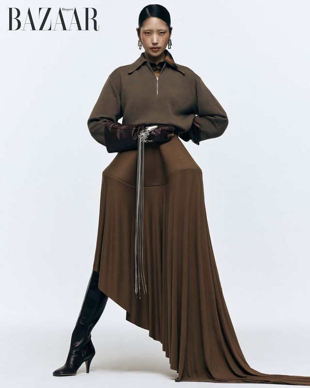 집업 톱, 언밸런스 저지 스커트, 롱 부츠는 모두 Phoebe Philo. 이너로 입은 셔츠는 We11done. 귀고리는 41만원 Portrait Report. 가죽 장갑은 Saint Laurent by Anthony Vaccarello. 핸드 커프 주얼리는 McQueen.