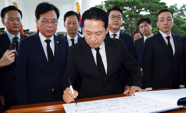 그는 "지금 대한민국 헌법 질서가 무너져 내리고 있다. 자유민주주의가 위협받고 있다"며 "피와 눈물로 지켜 온 대한민국의 자유와 번영을 반드시 지켜내겠다는 마음을 담아 첫 일정으로 현충원을 참배했다"고 밝혔다.