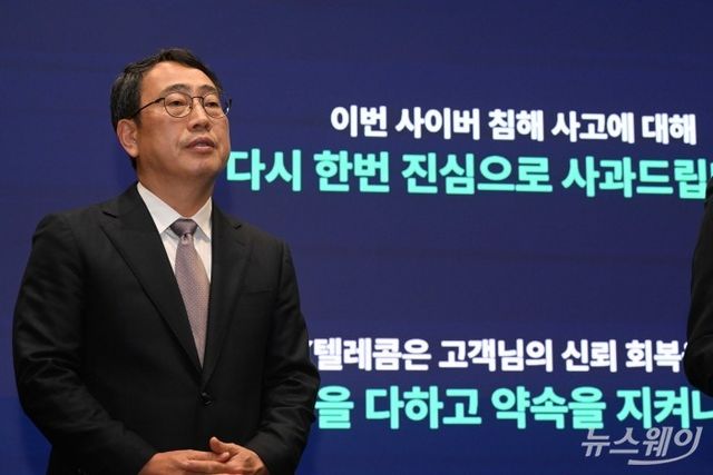 유영상 SK텔레콤 대표이사가 지난달 서울 중구 SK텔레콤 본사에서 열린 사이버 침해 사고 관련 기자회견에서 자사 입장 및 향후 계획 등의 발표를 마친 뒤 취재진의 질문을 경청하고 있다. 사진=강민석 기자 kms@newsway.co.kr