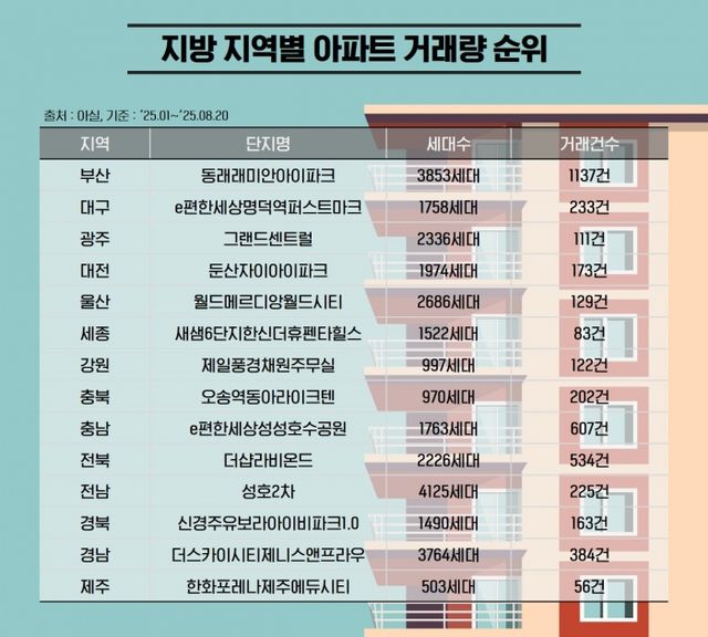 대표적으로 지방 5대 광역시의 거래량을 살펴보면, 부산에서는 3853가구 규모의 '동래래미안아이파크'가 1137건으로 지역 내 최다 매매를 기록했다. 이 외에도 ▲대구 'e편한세상명덕역퍼스트마크'(1758가구) 223건 ▲광주 '그랜드센트럴'(2336가구) 111건 ▲대전 '둔산자이아이파크'(1974가구) ▲울산 '월드메르디앙월드시티'(2686가구) 129건 등 모두 대단지 아파트가 지역 내 거래량 1위를 차지했다.