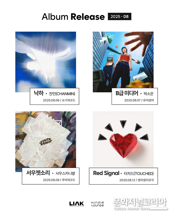 문화저널코리아 조정일 기자 | 한국음악레이블산업협회(음레협)가 운영하는 ‘킨디라운지’가 8월의 감성을 담은 신보 네 편을 소개한다. 이별의 여운, 솔직한 자아, 지역의 정서, 강렬한 콘셉트를 담은 이번 작품들은 각기 다른 음악적 색채로 여름의 끝자락에서 깊은 울림을 선사한다.