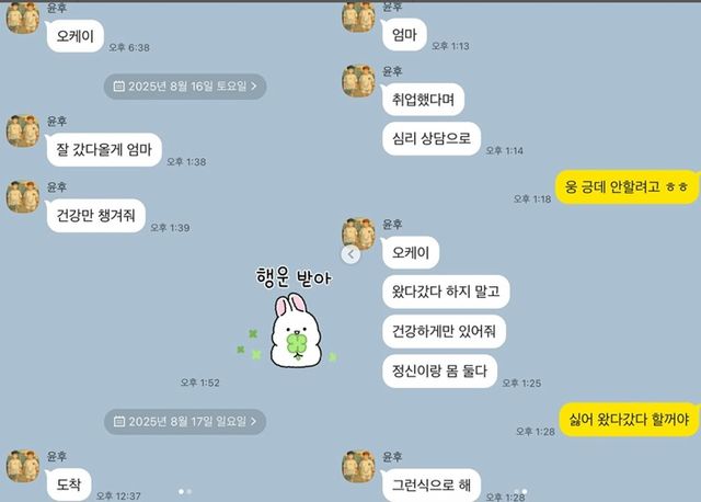'아들 자랑', '오늘 카톡', '윤후'라는 해시태그를 함께 붙인 만큼 윤후는 "잘 갔다 올 게 엄마. 건강만 챙겨줘", "엄마 취업했다며 심리 상담으로", "왔다갔다 하지 말고 건강하게만 있어줘. 정신이랑 몸 둘 다"라며 엄마를 알뜰살뜰히 걱정하는 모습을 보였다.