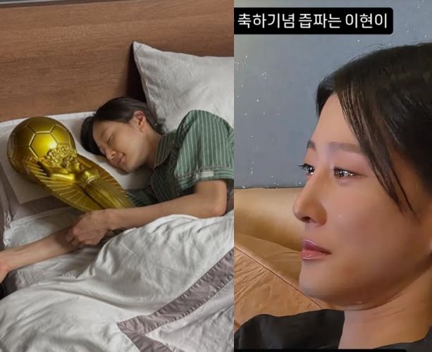 공개된 사진 속 이현이는 우승 트로피를 품에 안은 채 행복한 표정으로 침대에 누워 있어 눈길을 끈다.