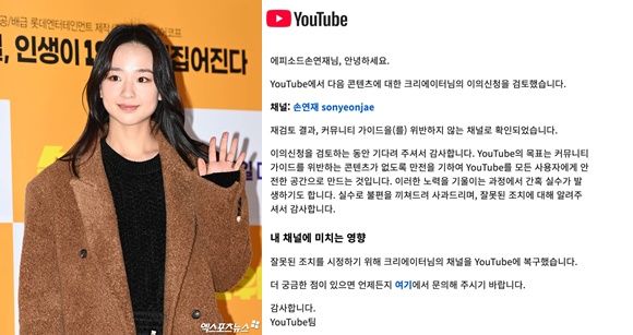12일 오전, 손연재의 채널은 정상적으로 복구됐다. 제작진은 "즉시 상황을 확인하고 유튜브에 이의신청을 제출했다"며 재검토 과정을 거쳐 채널이 복구됐다고 전했다.