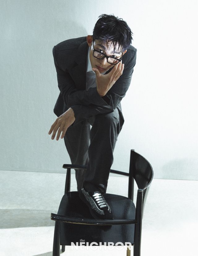 다크 그레이 재킷, 셔츠, 팬츠 모두 Dior. 스니커즈 Dolce&Gabbana. 아이웨어 Saint Laurent by Anthony Vaccarello.