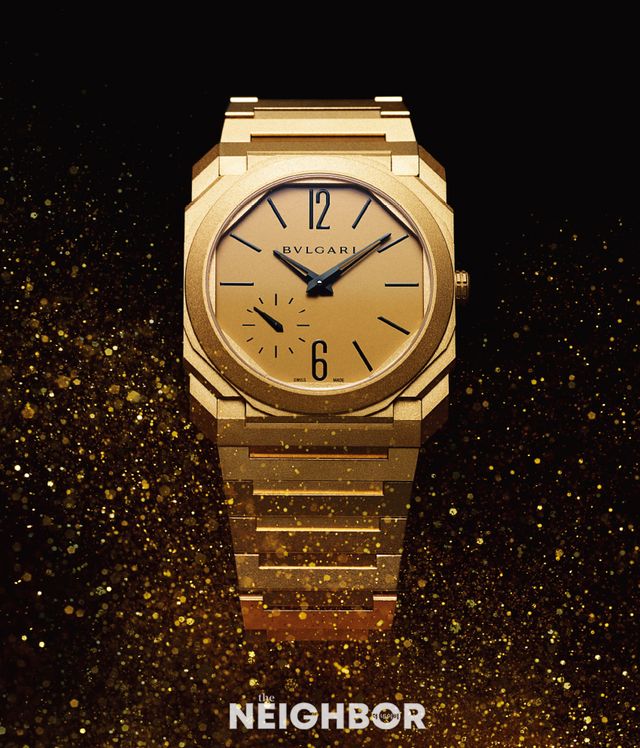 로마 막센티우스 바실리카 대성당에서 영감을 받은 팔각형 디자인과 워치메이킹 기술력이 결합한 옥토 피니씨모 오토매틱 워치. 두께가 단 2.23mm에 불과한 울트라-씬 매뉴팩처 무브먼트로 작동하며, 18K 옐로 골드에 샌드블라스트 마감 처리한 지름 40mm의 팔각형 케이스와 브레이슬릿은 매트한 질감과 차분한 골드 톤이 특징이다. 6천7백만원.