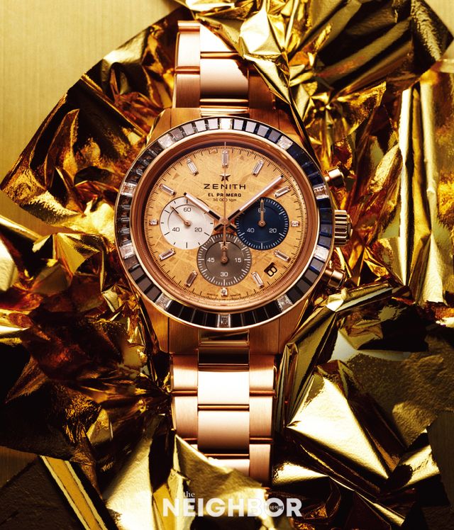 지름 41mm의 로즈 골드 케이스와 브레이슬릿을 갖춘 크로노마스터 스포츠 프레셔스. 운석 소재의 골드 다이얼에 삼색 아플리케 카운터를 배치하고, 베젤을 따라 총 5캐럿의 바게트 컷 화이트 다이아몬드, 블랙 스피넬, 그레이와 블루 사파이어를 세팅해 화려함을 더했다. 0.1초까지 측정과 표시가 가능한 인하우스 무브먼트 엘 프리메로 3600으로 구동한다. 1억9천7백32만원.
