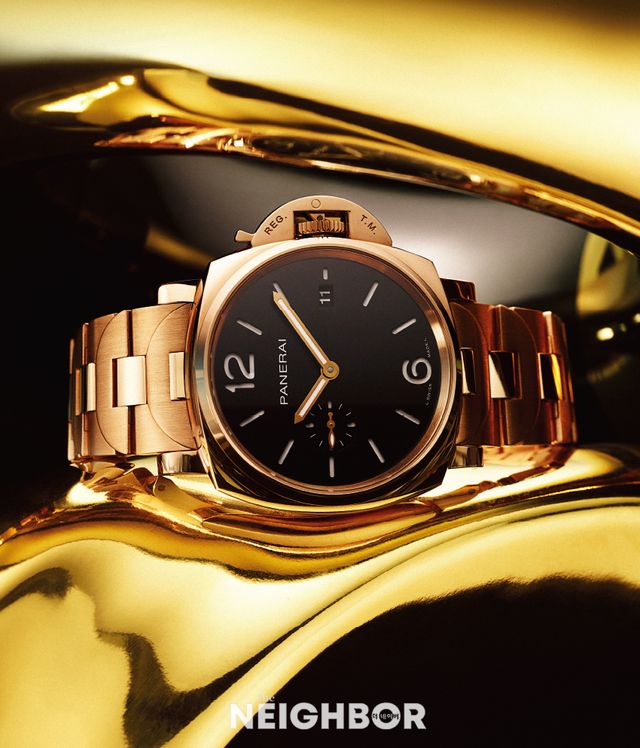 구리와 플래티넘을 조합한 레드 골드 컬러가 돋보이는 하우스 고유의 소재 골드테크™를 적용한 루미노르 두에 뚜또오로. 지름 42mm의 케이스와 선브러시드 마감 블랙 다이얼이 조화를 이루며, 72시간의 파워리저브와 50m 방수 기능을 갖춘 인하우스 무브먼트 P900을 탑재했다. 6천1백50만원.
