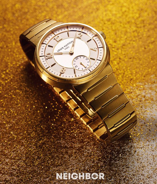 슬림한 옐로 골드 케이스와 매끄럽게 이어지는 일체형 브레이슬릿에 화이트 컬러 다이얼을 매치해 세련된 미학을 완성한 땅부르 오토매틱 워치.