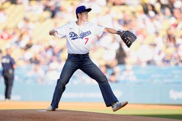 [서울=뉴시스] 미국 메이저리그사커(MLS) 로스앤젤레스(LA) FC의 손흥민이 27일(현지 시간) 캘리포니아주 로스앤젤레스의 다저 스타디움에서 열리는 2025 메이저리그 LA 다저스와 신시내티 레즈의 경기에 앞서 시구하고 있다.
