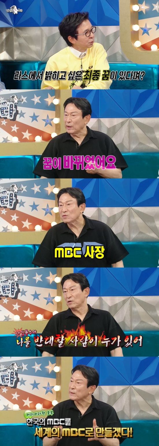 '라스'를 통해 새로운 꿈을 밝히겠다고 말한 것에 대해 김응수는 "작년 MBC 연예대상에서 나오라고 하더라. 저는 대상인 줄 알고 나갔는데 시사·교양 특별상을 받았다. 그 때 집에 돌아가면서 '올해는 그럼 대상을 받아볼까?' 싶었는데 꿈이 바뀌었다"면서 MBC 사장이 되고 싶다고 언급했다.
