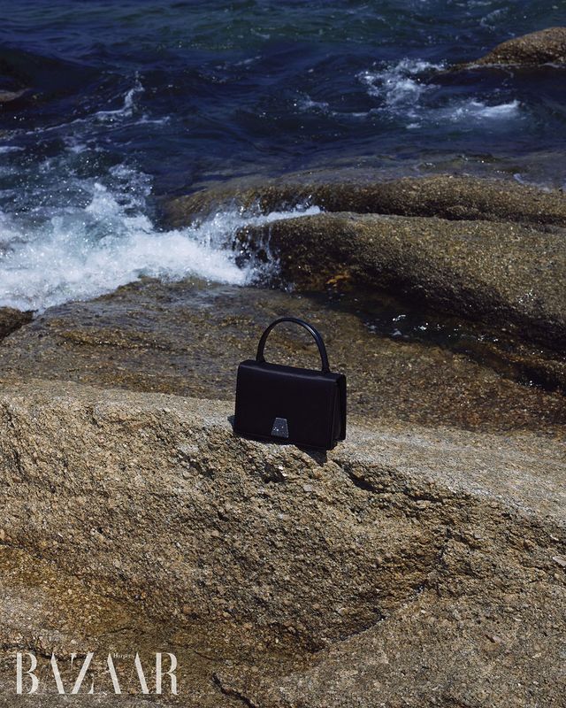 버클에 크리스털을 세팅한 블랙 새틴 ‘앨리스’ 백 미니 사이즈는 3백50만원 Akris.