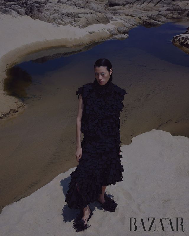 깃털 장식 드레스는 5백60만원 Akris. 귀고리는 에디터 소장품.