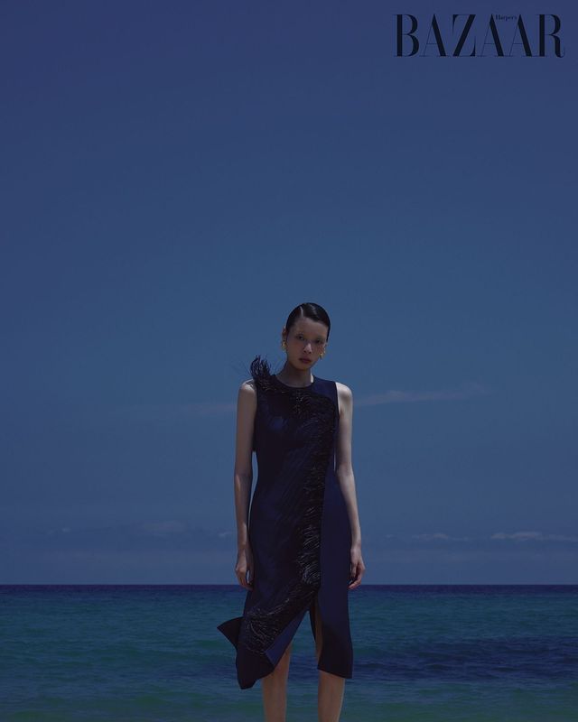 현대미술가 앨리슨 쇼츠의 시아노타입 프린트가 담긴 드레스는 5백60만원 Akris. 귀고리는 에디터 소장품.