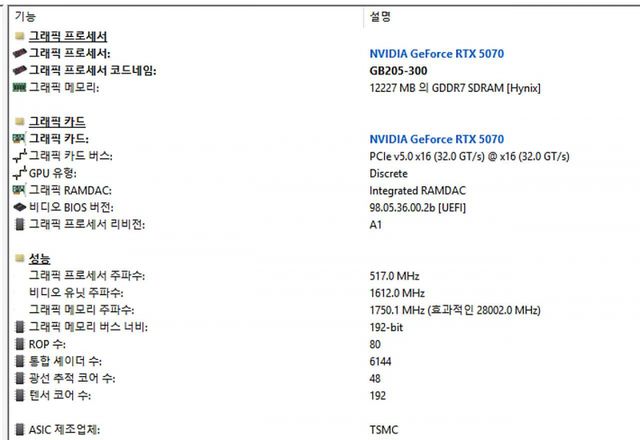 칩셋 : NVIDIA GeForce RTX 5070 (4nm)