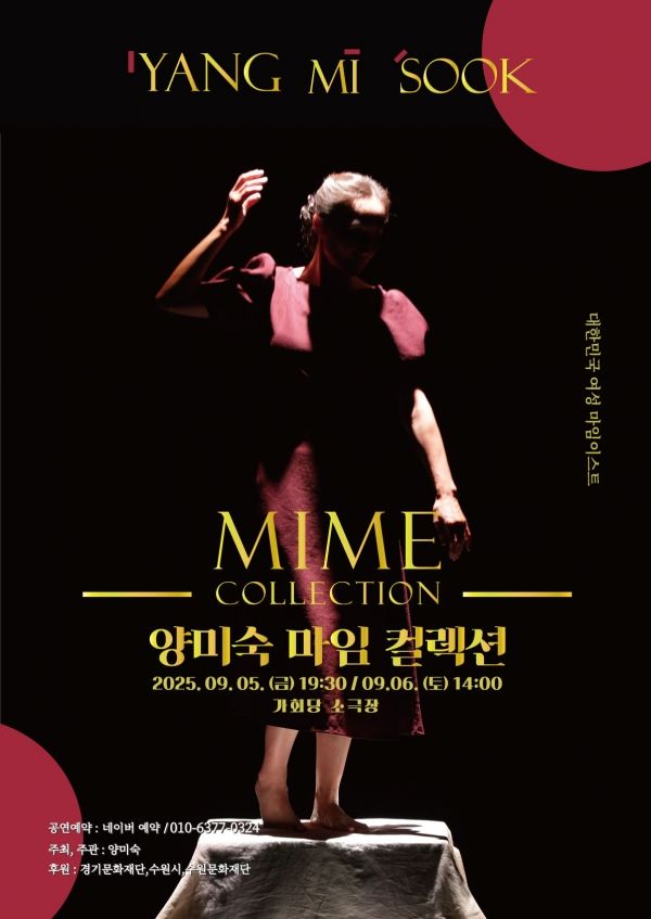 경기문화재단과 수원시, 수원문화재단에서 지원을 받은 ‘양미숙 마임 컬렉션’이 2025년 9월 5일(금)부터 6일(토)까지 수원 소극장 가회당에서 공연된다.