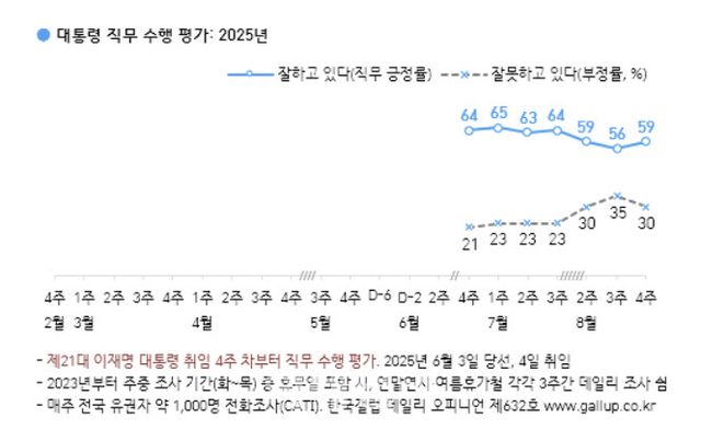 한국갤럽이 지난 26~28일 전국 만 18세 이상 유권자 1000명을 대상으로 조사한 결과, 59%가 이 대통령의 직무 수행을 긍정적으로 평가했고, 30%는 부정 평가했다. 11%는 의견을 유보했다. 전주 대비 긍정 평가는 3%포인트(p) 상승했고, 부정 평가는 5%포인트 감소했다.
