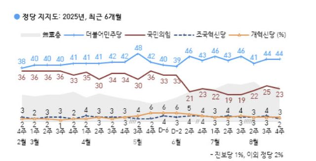정당 지지율을 보면 더불어민주당이 44%로 선두를 달렸다. 이어 국민의힘 23%, 개혁신당 3%, 조국혁신당 2%, 진보당 1%였다. 무당층은 25%로 집계됐다. 성향별로는 진보층의 75%가 민주당, 보수층의 56%가 국민의힘을 지지했다. 중도층에서는 민주당 48%, 국민의힘 14%, 특정 정당을 지지하지 않는 유권자가 31%였다.