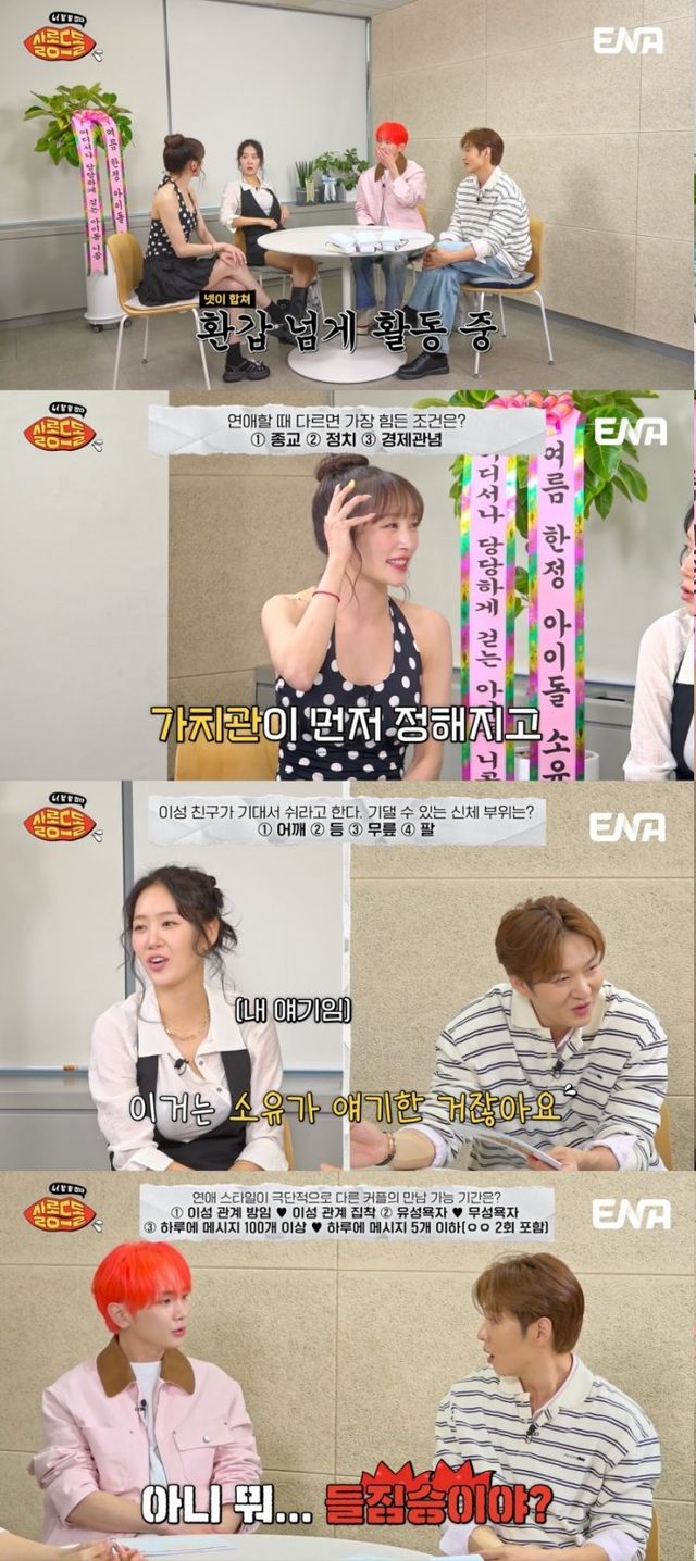 연애할 때 가장 맞지 않으면 힘든 조건에 대해서도 솔직한 토크가 이어진다. '종교, 정치, 경제관념' 중 무엇이 가장 큰 장벽인지 묻자 키와 소유는 "경제관념이 다르면 보는 것만으로 스트레스를 받는다"고 입을 모은다.