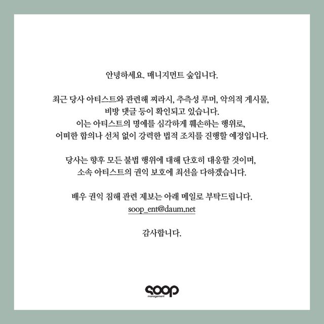 29일 수지의 소속사 매니지먼트 숲은 공식 계정을 통해 "최근 당사 아티스트와 관련해 찌라시, 추측성 루머, 악의적 게시물, 비방 댓글 등이 확인되고 있다"며 "이는 아티스트의 명예를 심각하게 훼손하는 행위로, 어떠한 합의나 선처 없이 강력한 법적 조치를 진행할 예정"이라고 전했다.